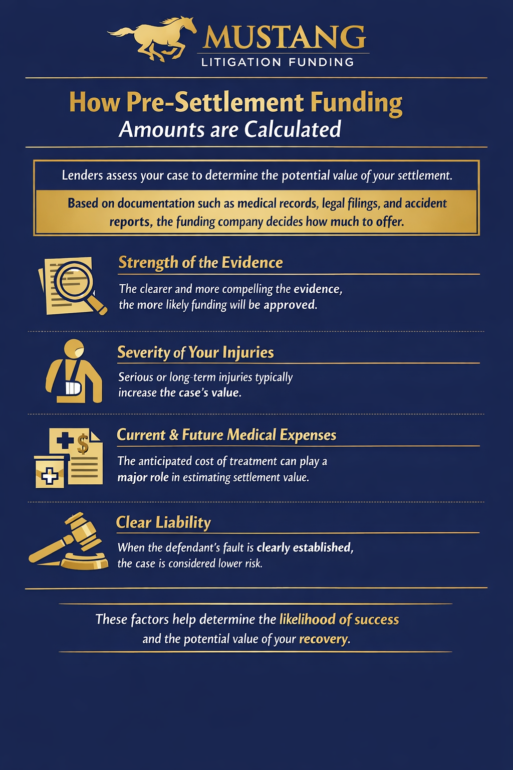 Most lenders can’t tell you how much funding you may receive until they evaluate the details of your case. Your attorney works with the lender to help assess the potential value of your settlement. Based on that evaluation, and documentation such as medical records, legal filings, and accident reports, the funding company decides whether to approve pre-settlement funding and how much to offer